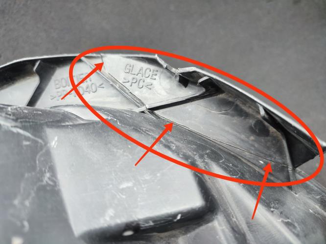 ⚠️ Deux pattes fissurées, 1 au dessus +1 en dessous + rebord noir fissuré vers la pointe intérieure ( voir photos avec repères rouge )