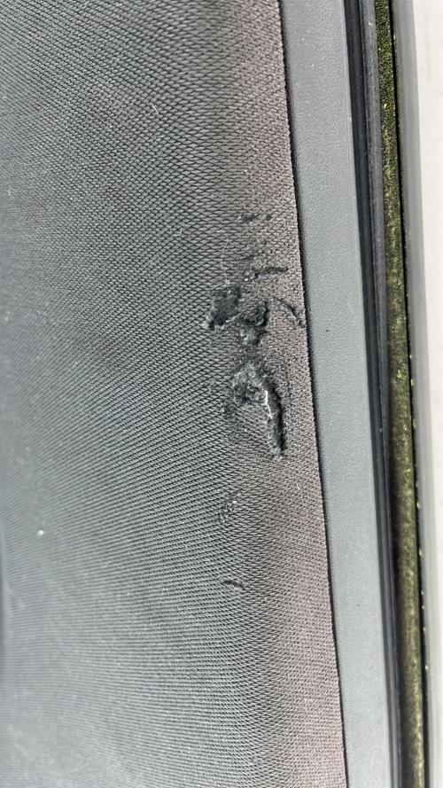 - Plusieurs rayures, un gros impact vers la poignée extérieure, tissu du panneau de porte légèrement déchiré en haut