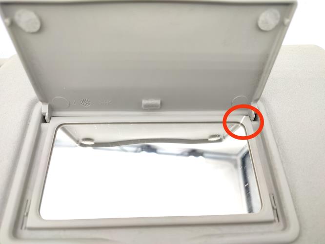 ⚠️ plastique fissuré sur le côté de la glace ( voir photo avec les repères rouge )